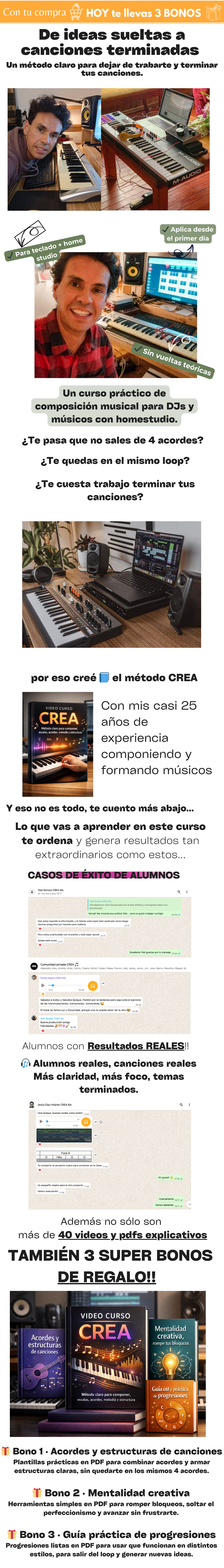 “Salí del mismo loop de siempre.” Yo hacía música con los mismos 4 acordes y no sabía cómo avanzar. Con el Método CREA entendí escalas y acordes de forma simple, y ahora sé terminar canciones con estructura.